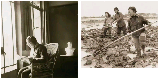 专题展厅中相关照片。图左:张韧下乡前家住淮海中路培文公寓,图右:从大上海来到广阔天地,从学生变农民。