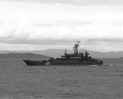 蟾蜍级坦克登陆舰,舷号077,1975年服役,是苏联在1965年开始建造的首批大型登陆舰鳄鱼级基础上发展起来的坦克登陆舰,满载排水量4080吨,舰长112.5米,舰宽15米,航速18节,最大续航力6000海里,可搭载482吨货物。可搭载10辆主战坦克或12辆装甲车,另外还包括300名左右的士兵。配备4座舰空导弹发射装置,1座76毫米单管舰炮,2座30毫米六管舰炮,122毫米火箭发射装置和反蛙人火箭筒。