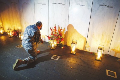 宾夕法尼亚州一名国民警卫队成员在当地的“9·11遇难者之墙”前下跪,悼念“9·11”恐袭罹难者。