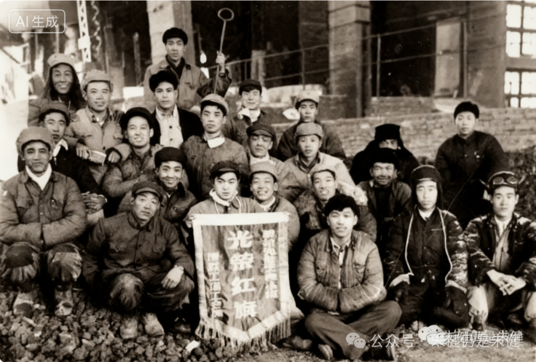爸爸和炼铁高炉的战友们鏖战后夺得光荣红旗,那艰苦的场景一览无遗