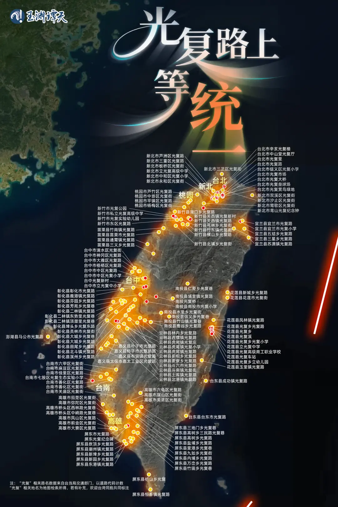 第一,当前在台湾以“光复”为名的路就有151条,以“光复”为名的建筑、机构等更是不计其数。“光复路”,是岛内民众的必经之路,“光复纪念日”,更是两岸统一的历史之路。