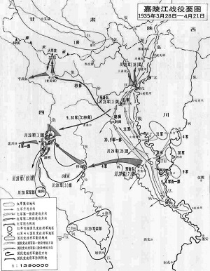 经过仔细比较,徐向前最后将渡江地段选在田颂尧的第29军防区,在苍溪至阆中之间选定了三个渡江点,并将苍溪东南的塔子山一带,确定为主要渡江点。这里江面开阔,水流较缓,西岸滩头平坦,易于部队抢滩和迅速展开,并向纵深发展。而东岸的塔子山俯视西岸,便于发扬火力,实为理想的渡江点。更为有利的是,田颂尧虽然拥有三十三个团担负江防任务,却以河段的宽窄决定兵力部署,见此段江道较为宽阔,且后面有剑门关天险,就断定红军不会由此渡江,因而百里江防只部署了三个团,而担负江岸防御的只有四个营。田颂尧待在屋里看着地图部署防御,结果主次颠倒,强弱不当,最终让徐向前打了一个措手不及。战后,田颂尧不得不承认徐向前用兵刁钻细致,说:“匪军竟能乘虚进攻,真可谓善于选择弱点。”