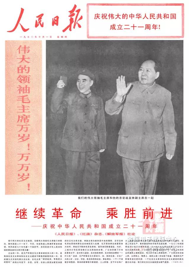 十月一日,《人民日报》第一版,只有文字,没有一张图片,既没有毛、林二人的合影,也没有毛泽东个人的照片。同时,这一天,“两报一刊”也没有发表国庆社论。