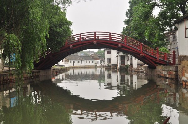 从颐浩禅寺出来,顺着河水继续在上塘街行走。突然发现,有一座红色的桥横在小河上——普庆桥!这座普庆桥是1999年应美国WBGH制版公司为NOVA专栏制作《中国虹桥》节目需要,来仿照宋代画家张择端所绘制的(清明上河图)汴水虹桥之单孔木拱桥。普庆桥在建造时完全依照古代建桥工艺,采用无支架施工法,把64根拱圈木与5根横梁木形成拱圈,全部用捆绑式结扎在一起,整架桥没用一根钉子,再现了中国古代精湛的造桥工艺,具有华丽美与富丽美。据说,当初为此桥,摄制组先去了朱家角,后了解到金泽镇是古桥最多的地方,便来到此地。此桥体为朱红色,桥身上左右两边各嵌有五个狮子探头,一如桥面重压在狮子身上一般。狮子气守丹田,气冲脸皮,不敢松懈,以防桥木散架,狮子造型,神态逼真,憨厚可鞠。桥脚下河边,停一条漂亮的小船,后来才知道,此河上,就此一条船(或者人家的船都么出来?)。老板娘看我拿着相机在拍,就说,坐船吗?问:多少钱?答:几个人?问:就我一个;答:那就30RMB。好家伙,包船啊~~。说好价格,老板娘急急打电话,把老公叫出来,我一惊?!他老公陪我?把我卖了?原来,这是夫妻老婆船,老婆摇橹,老公讲解。。。。。。一惊一乍。老板+老板娘一路摇橹讲解,给没做功课的我,解决了很大的问题。否则,这一路真是看啥不知道啥呀~