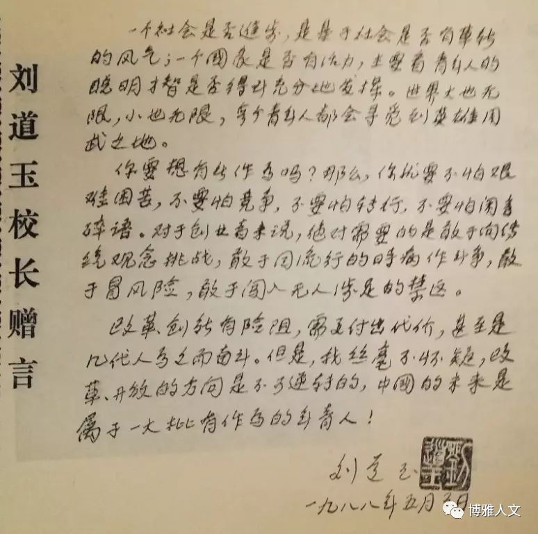 时值春节前夕,消息传出,全校哗然,业内震惊。校内外为我请愿的信函纷纷寄到北京,质问这是为什么?虽然这些于事无补,但是为我鸣不平的深情,却使我得到了极大的慰藉。正如一位教授对我所说:“道玉同志,你被免职是因为你的观念超前了,改革的步伐太大了,致使那些‘九斤老太们’不能容你。”我心想,是呀,我32岁任副教务长,39岁任党委副书记,45岁任教育部党组成员兼高教司司长,48岁任大学校长,54岁被免职。所以,有人说,我是个超前的人,不仅教育观念超前,而且任职和离退也都超前了。