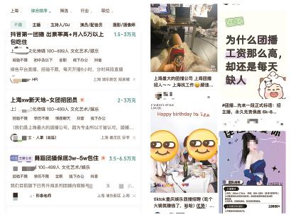 一位长期从事互联网直播运营的业内人士告诉记者,目前的团播大致可分为两种模式:一种是主打才艺展示的专业型团播,舞台专业、规模较大、设备和人员成本较高;另一种则是以“拉票变现”为主的团播,直播间造价成本低,主要通过PK等方式赢得打赏。目前,在各大社交平台和招聘软件上活跃的,多是后者这类团播公司。他们用“零基础上镜”“颜值变现”“月入过万”“女团出道梦”等宣传语包装岗位,营造出一种轻松赚钱的职业氛围,吸引不少年轻人入行。