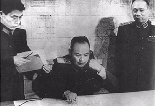 ◆1955年11月,叶剑英主持辽东半岛方面军抗登陆战役中集团军海岸防御的军事演习。图为叶剑英给演习部队下达攻击命令。