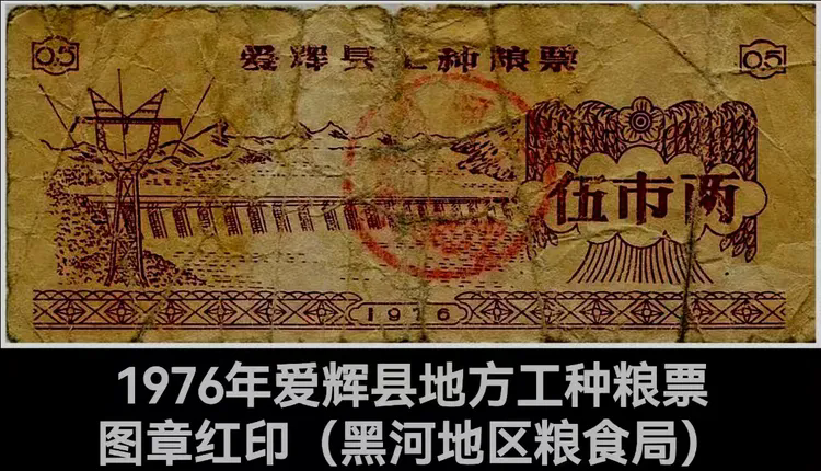 我攥着一张省壹斤粮票,老板娘接过壹斤票,麻利地煮了二两面条,找回的八两粮票里,其有一张反复使用皱巴巴的伍两工种粮票格外醒目,靛蓝色底纹印着“爱辉县工种粮票”,中间印着黑河地区粮食局大紅印,边角还沾着面粉的细屑。