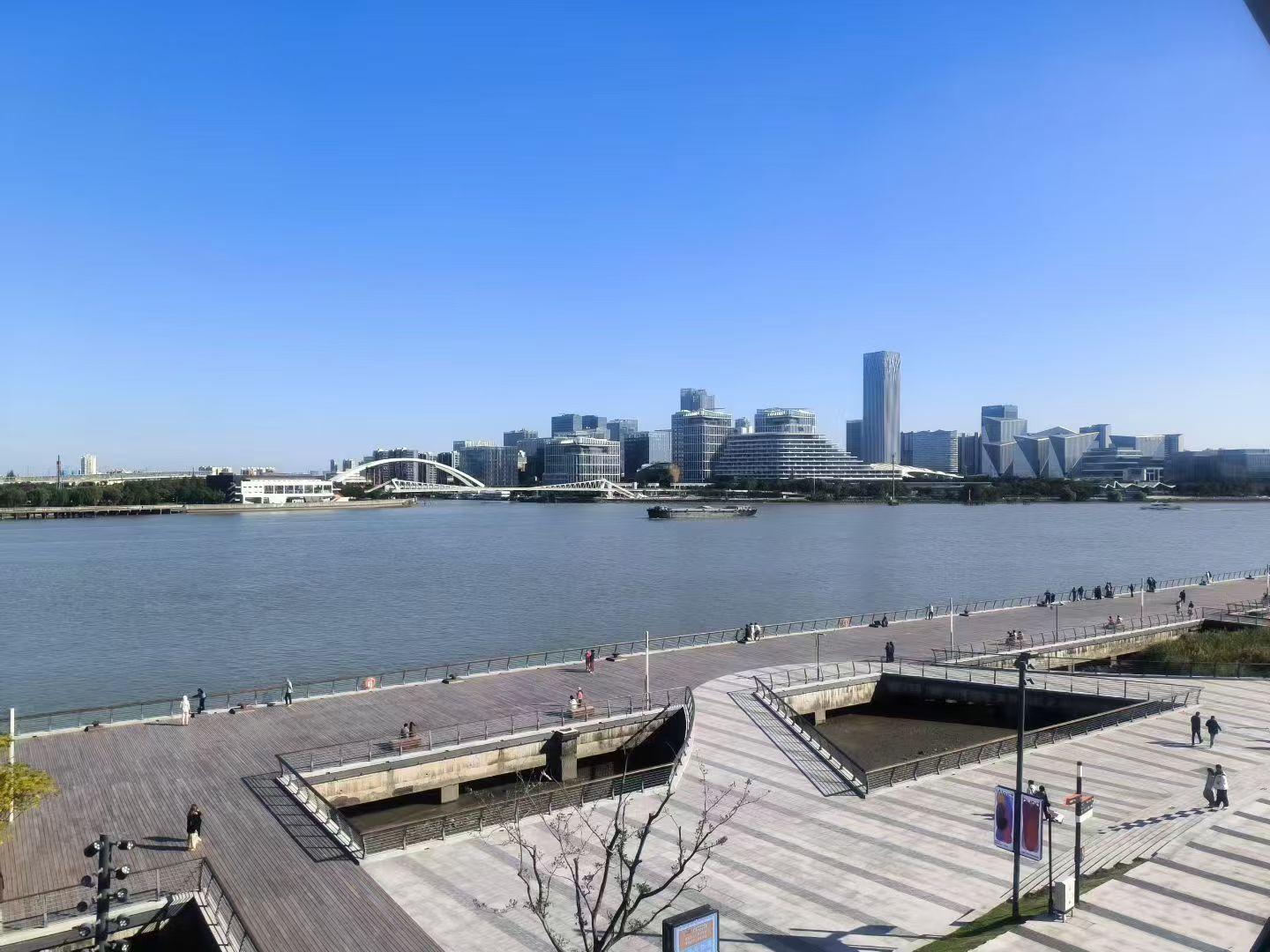 眺望对岸,一幢幢高楼拔地而起,呈立体几何状的建筑造型独特,玻璃幕墙在阳光下折射出璀璨的光芒,尽显现代建筑的简约与大气。