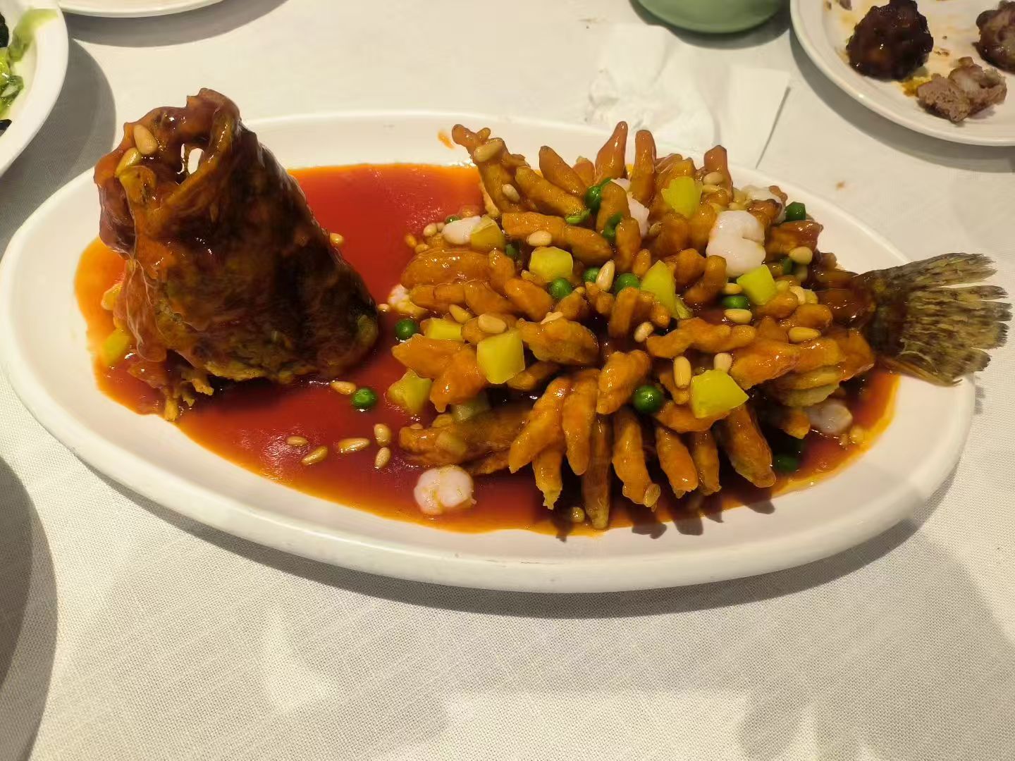 入席点菜,服务员随后拿着餐具和一壶水走来,估计是新手,到我边上,欲将手拿之物置放桌子,手一歪,壶里的茶水竟洒在了我裤子上。
