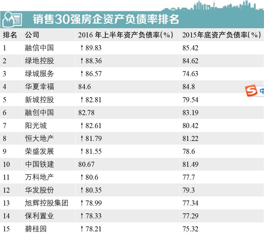 负债率最高的房企仍是融信中国。上半年资产负债率为89.83%,较去年年底85.42%的负债率增加4.4个百分点。绿地控股的资产负债率则由2015年底的84.62%增加到了上半年的88.36%。万科地产、中国铁建、荣盛发展、绿城服务、新城控股的资产负债率均超过了80%,而在2015年底他们的负债率还在80%以下。