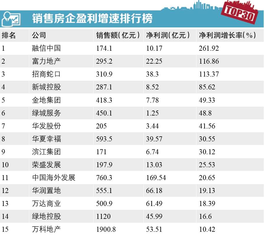 30强房企盈利排行榜中,净利润同比增幅达3位数的房企有3家,分别是:融信中国(净利润上涨261.92%)、富力地产(净利润上涨116.86%)、招商蛇口(净利润上涨113.37%)。
