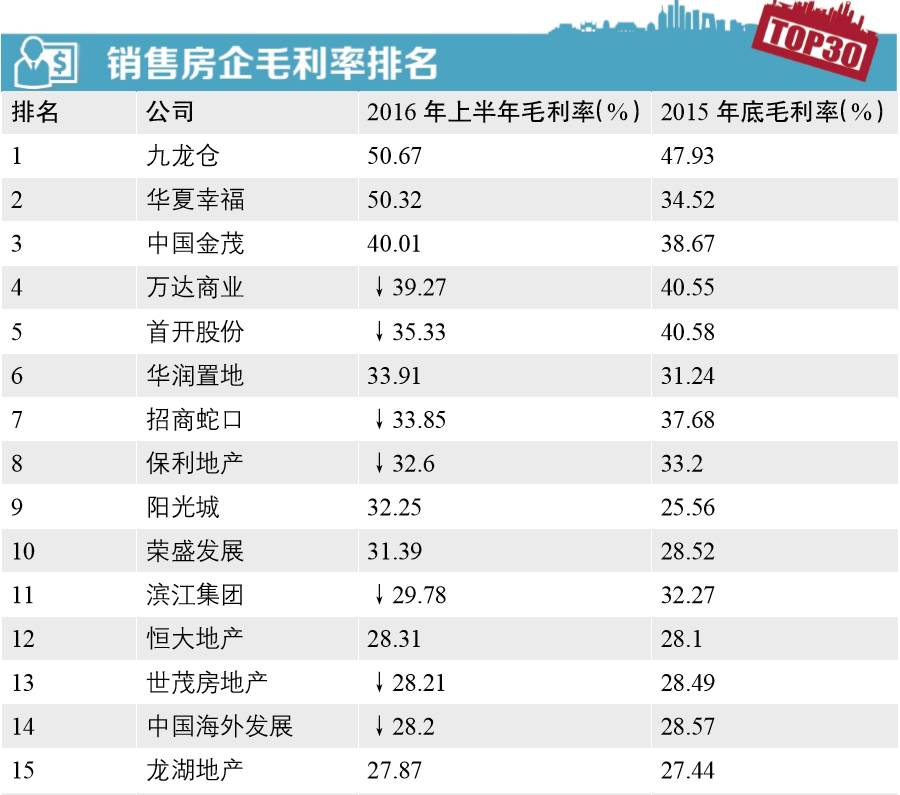 不过,仍有15家上市房企出现毛利率上升情况。毛利率最高的房企是九龙仓,上半年毛利率达50.67%,较2015年底47.93%的毛利率抬升了近3个百分点。