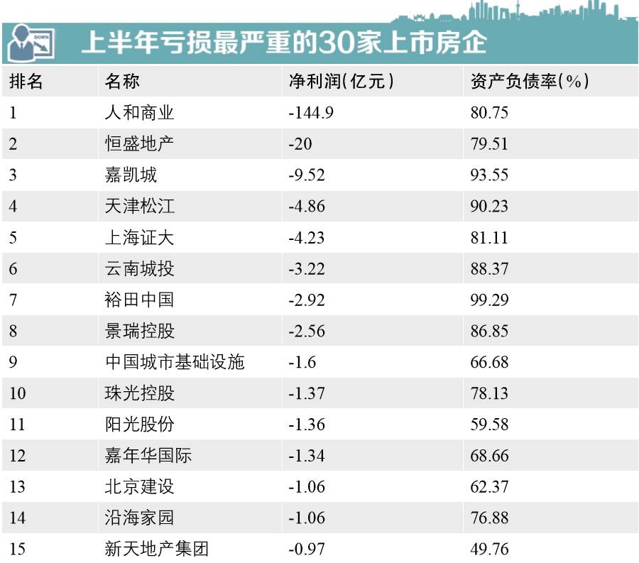 据中国房地产报记者统计,上半年亏损最为严重的上市房企是人和商业控股有限公司,上半年亏损了144.9亿元;排在其后的恒盛地产上半年亏损了20亿元;排在亏损榜第三位的嘉凯城上半年亏损9.52亿元,资产负债率更是高达93.55%,利息支付倍数为-59.41%,显示嘉凯城目前营业收益甚至远远不足以偿付借款利息。