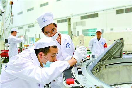 上海载人航天团队在测试厂房对对接机构进行检查。