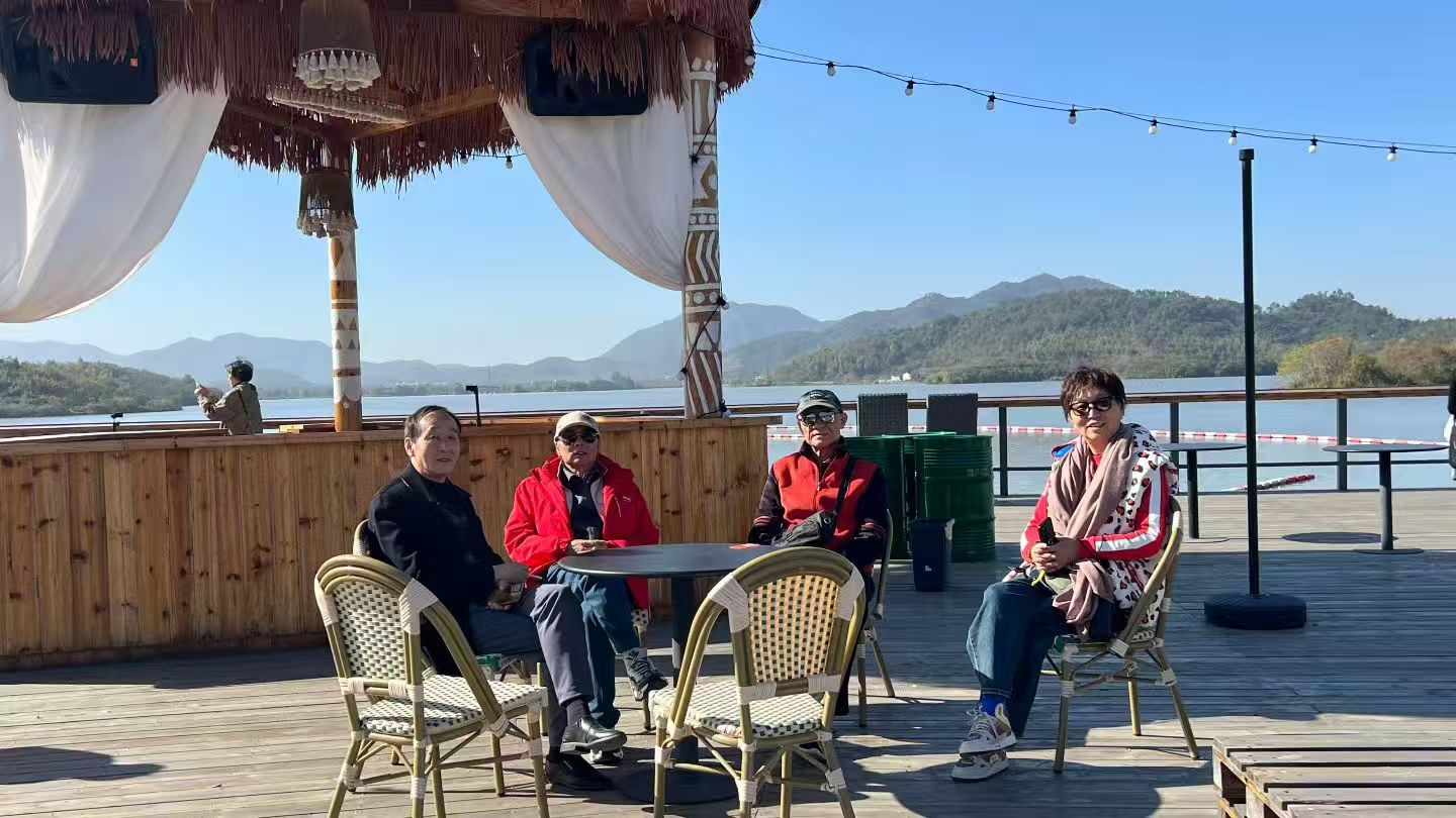 我们倚着湖边长廊歇脚,晒着暖融融的太阳,唠着从前在北大荒的趣事,也说着如今的家常,话语间满是自在,湖面的清风携着笑意飘散,满是岁月静好。