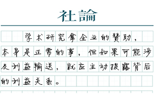 学术研究拿企业的赞助,本身是正常的事,但如果可能涉及利益输送,就应主动披露背后的利益关系。站在明处,说话才敞亮。之前,就发生过某大学教授的“小鼠黑肺试验”被赞助其研究的某药厂,放到公共媒体上,做了“恐慌营销”,造成了很恶劣影响。