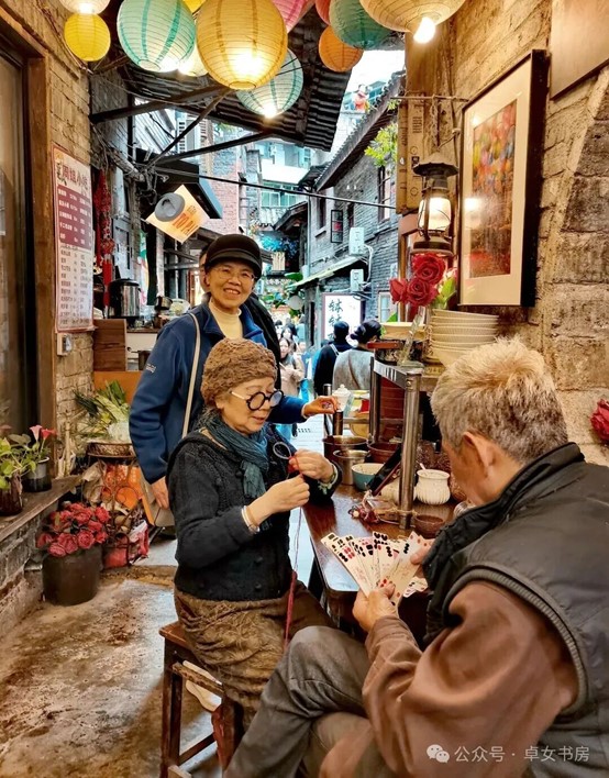 山城巷的雅韵,还藏在不起眼的角落里。依山而建的栈道旁,有一个老茶馆,木质的桌椅透着古朴,桌上茶香袅袅。说书人端坐台上,语调抑扬顿挫,讲述着老重庆的典故。台下的茶客听得入神,时而大笑,时而喝彩,像是在观看一出精彩的川剧折子。