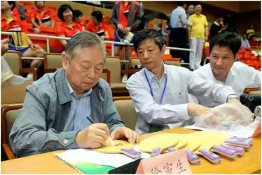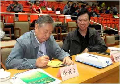 真是机会难得,我也想与他合影留念,要求一提出他立马答应,让我上主席台合影留念。合影有了,签名怎么办?我向主办方提出给整一块,他们口头是答应的但是要等运动员发完后再考虑。为了保险起见,我看到比赛现场有商家在出售运动服和乒乓拍的,于是上前打听价格,好的拍子要1000多元,最便宜的240元,我没有多加思索240元买了一块。当我兴致勃勃拿着拍子去见徐时,他第一句话就是问我多少钱,我说240元,他就说了一句“ 嘎居阁!”(上海话,意思是“这么贵啊!”)。当我表示诚心诚意要请他签字时,徐随即让我告诉姓名,并问想题写些什么内容,我也不加思索地告诉他我是知青,到如今这个年龄希望他对我们这一代人在健康方面提些要求吧!