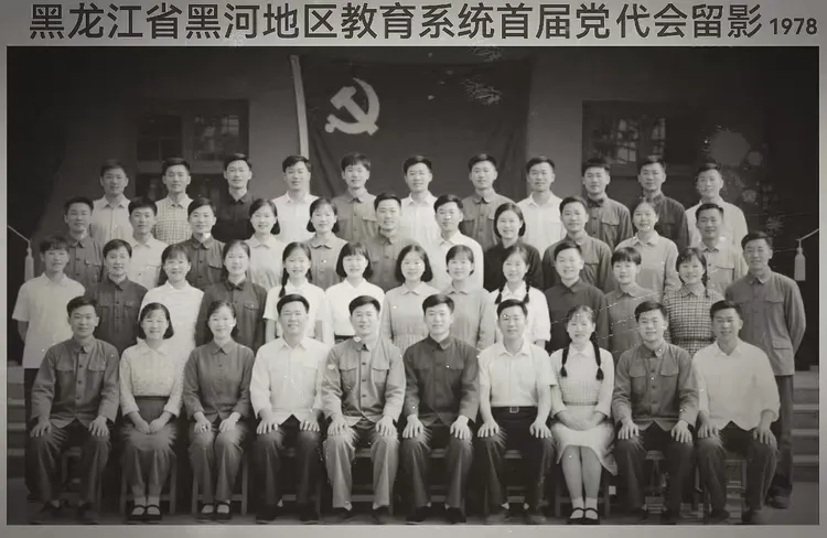 1978年,戊午马年,我站在黑龙江黑河地区教育系统首届党代会代表合影中,与45名来自黑河地区中小学和师范学校的青年优秀党员并肩而立。