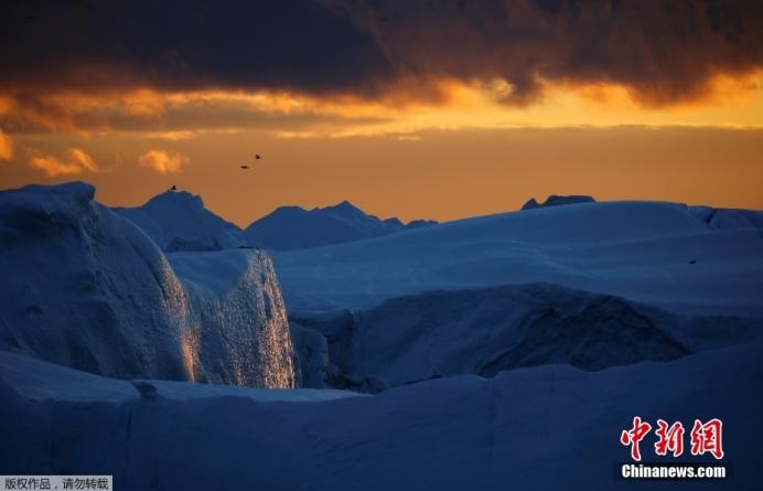 资料图:格陵兰岛伊卢利萨特附近的迪斯科湾,日落时,阳光反射在冰山上。