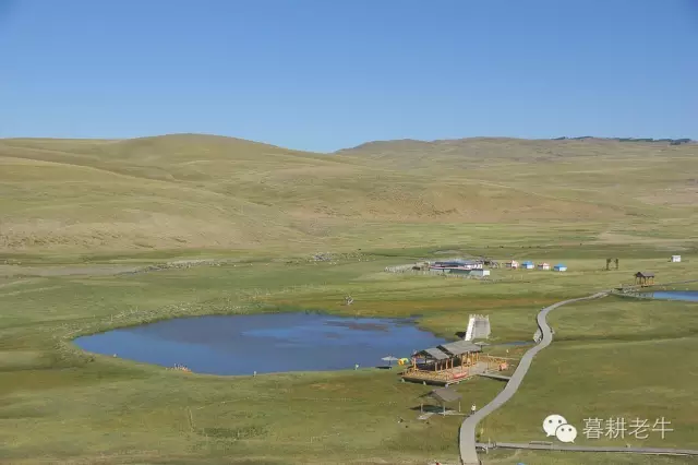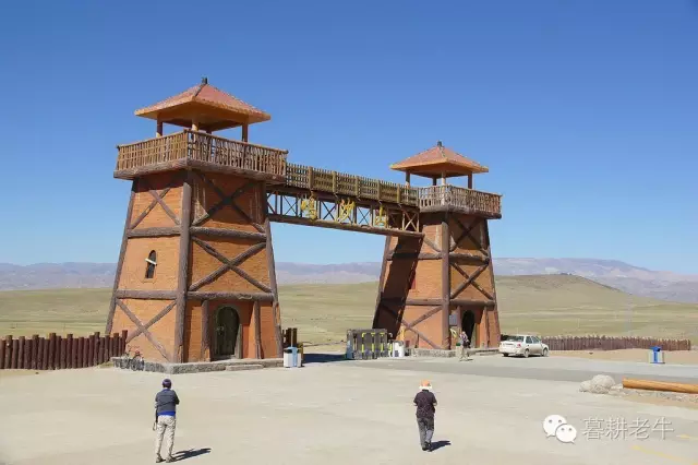 穿过景区高大的门楼,沿木栈道前行,可见牛马羊群散于草原上。