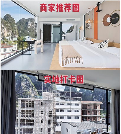 无独有偶,从阳朔旅游归来的王倩(化名)也遇到了“照骗”。预订时,商家提供的照片显示,卧室落地窗正对一片山景。虽然低矮处有一些楼房,但总体不影响阳光明媚、视野开阔的视觉效果。可入住时,王倩发现商家发布的照片不仅颜色和光线用修图软件调整过,就连景色也大不一样:落地窗前有好几栋正在建设的楼房,整个民宿好像在一个大工地里。