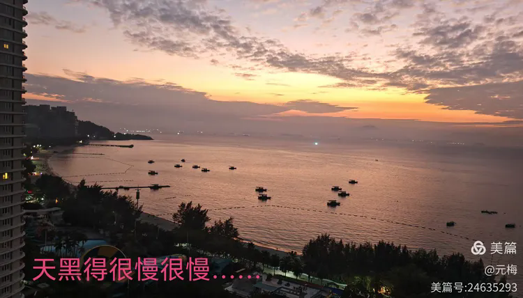 在大海边避寒,看着满天晚霞映红了海面。心想:如今生活宽裕了,我已到古稀之年,很珍惜当下,过好余生。