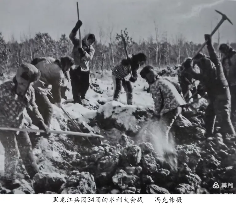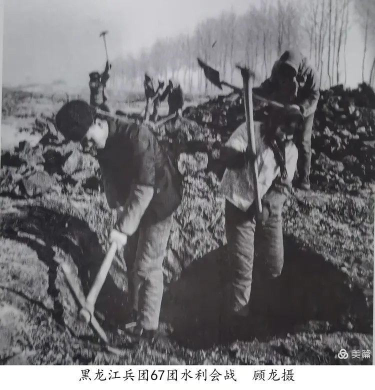 修渠劳动简单说就是按要求挖一条上宽28米,底宽13米,深2.8米的渠道。土挖出来挑到两侧堆高。北大荒的冬天挖土可不是一件容易的事,冻土层厚达一米多,一镐砸下去只有一个小小的白点,铁锹更是挖它不动。那时候有句话叫“地大冻,人大干!”我们硬是用镐刨,用锤打钎,打出一个个炮眼,塞进炸药,崩开冻土,再把大冻块敲开,然后把土一筐筐挑到两则压实并做出斜坡。大家挖的挖,挑的挑,大土块就永双手抱。遇到的第一个难题是挖开的后的土壤一晚上就冻得硬硬的,又得打眼放炮,又累又麻烦,进度也慢,危险性也大,稍不留神就可能出大事故。人终究是聪慧的,脑筋一动,办法就有了:每天收工前,大家在挖开的地方按二三米的间距呈网格状挖成二三十公分的沟,再用干土覆盖。因干土冻不实,第二天很容易就刨开了,然后用钢丝绳套住冻土,让拖拉机来拉,一下子就把冻层掀开了,大大加快了施工进度。