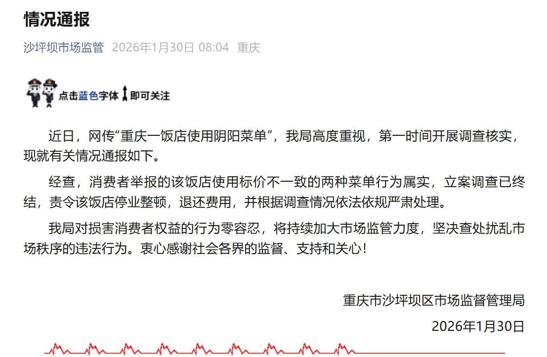 近日,网传“重庆一饭店使用阴阳菜单”,我局高度重视,第一时间开展调查核实,现就有关情况通报如下。