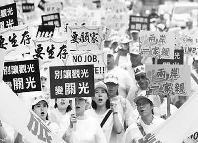 民进党执政百天,民怨四起。图为9月12日,台湾观光业界冒雨大游行。