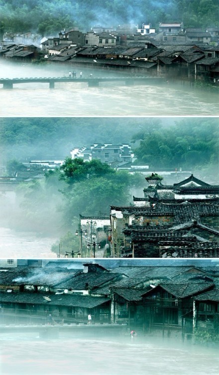 一溪流云轻梳妆。微风岸,碧如簪。黑瓦白墙,一纸红尘淡。流水迢迢自吟唱,思忆长,梦江南。