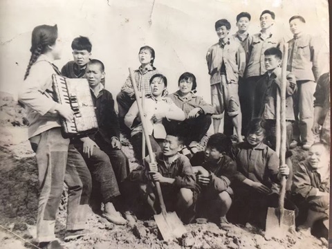 下:陈必圭自幼爱好文艺,在农村发挥了她的爱好特长,这是她在出工之余给知青和老乡拉琴。左一为陈必圭。现定居美国)