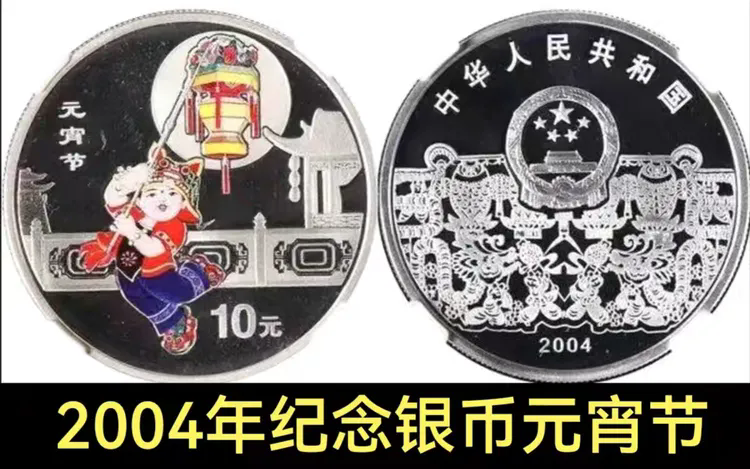 而最让我心动的,是2004年那枚中国人民银行发行的元宵节纪念银币。银币上的图案是孩子提着花灯奔跑,背景是挂满灯笼的楼阁。