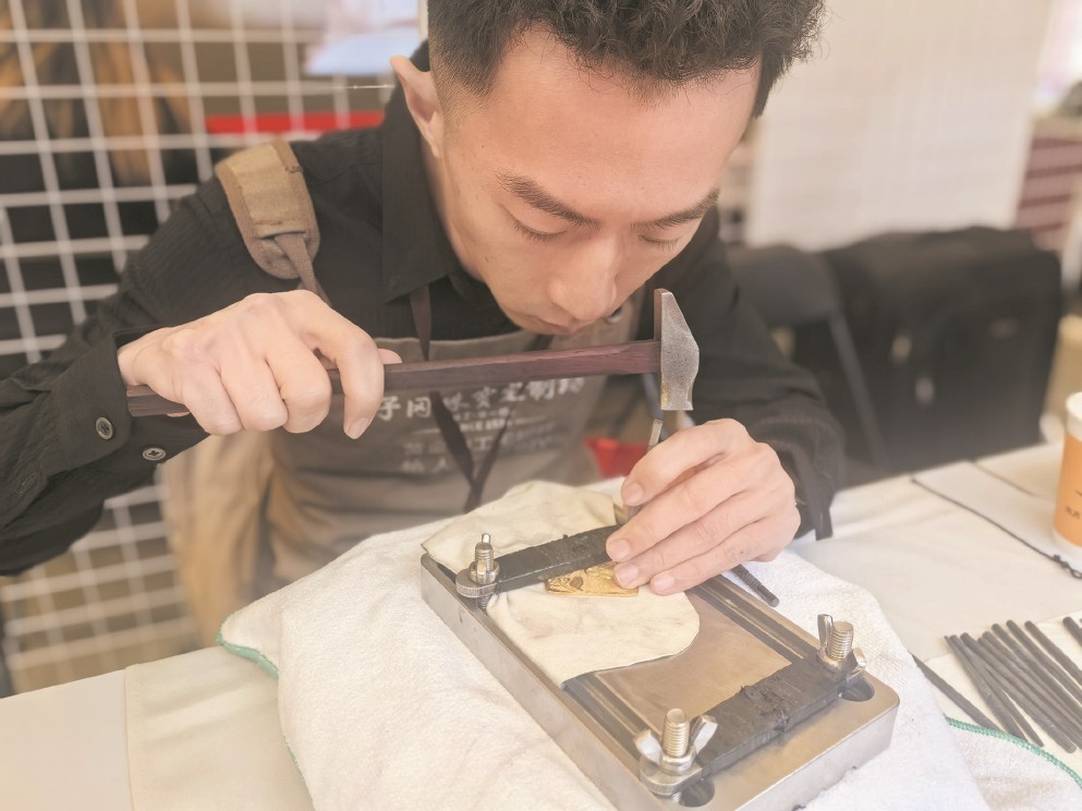 回到现场,95后工匠郭珺文正在演示錾刻——这是“打金”中最显手艺的环节。錾刻台上,金器被固定,他手持小榔头敲击錾刻刀,“叮叮当当”一点一点敲出纹样。“一般要经过几万次,才能达到预期效果。”他说。摊位前,几位上海阿姨凑近仔细围观,问道:“蛮灵,黄金有损耗伐?”