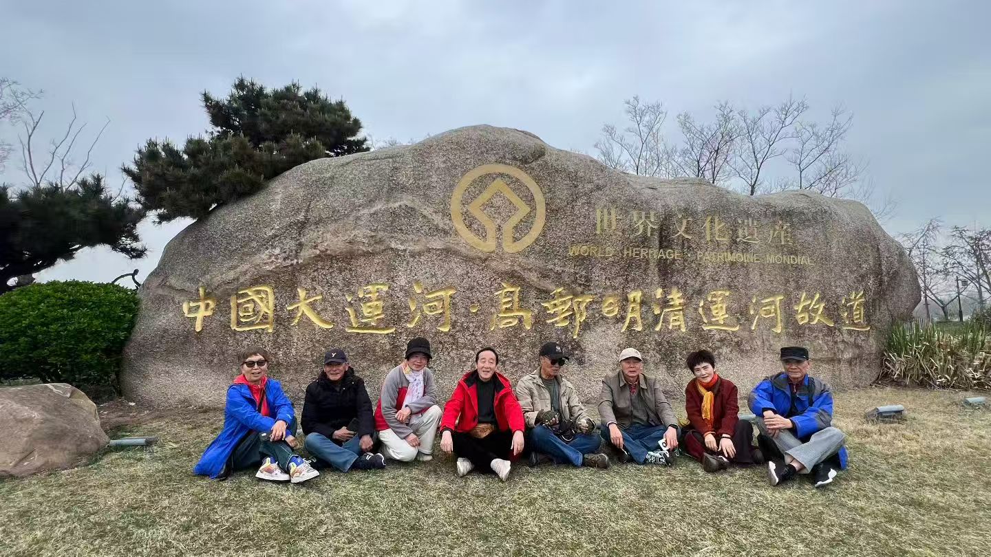 清晨的薄雾还未散尽,我们便站在了中国大运河·高邮明清运河故道的石碑前。这块镌刻着世界文化遗产的巨石,静静诉说着千年漕运的繁华往事。脚下的草色虽还带着些浅黄,却已能嗅到春的气息,就像我们这群鬓染霜华的老友,历经岁月沉淀,依旧怀揣着对生活的热忱。大家围坐石前,快门按下的瞬间,定格的不仅是身影,更是那段跨越半个世纪的情谊——在这“楚国舟船路”的起点,我们用重逢,温柔地消解了别离的惆怅。