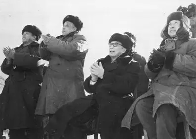 1966年10月,钱学森(右一)和聂荣臻(右二)主持核导弹发射试验