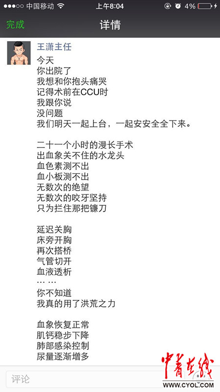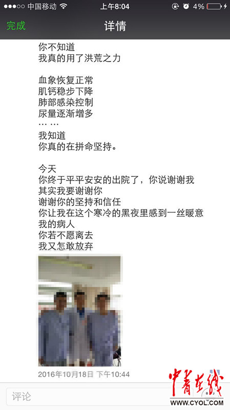 诗句发到朋友圈后,医务同行纷纷转发。一名患儿的父亲看到后说,“生死只是一线间,医生每天都在挽救生命,医患之间,信任为先,医患合力,才能击退共同的敌人——病魔。”