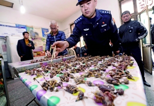 昨天,市园林局森林公安局与执法监察大队联手, 分14路突击通州、大兴的鸟市、果园和餐馆,查处捕猎和售卖野鸟的违法行为。