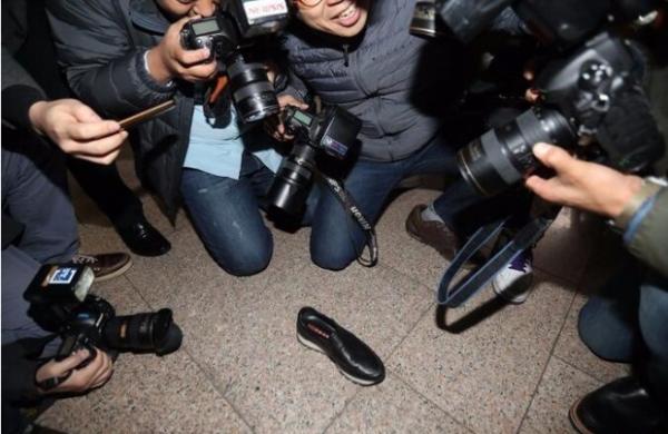 崔顺实离开检察厅门口十几分钟后,这只被挤掉的“普拉达”鞋子被放在检察厅的入口,韩国网友将其照片放到网上疯狂转发,有人用“穿普拉达的魔鬼”这一电影名来形容刚发生的一幕。