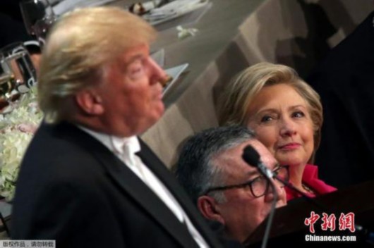 图片说明:当地时间2016年10月20日,美国纽约,第71届Alfred E. Smith纪念基金会年度晚宴,民主党总统候选人希拉里、共和党总统候选人特朗普亮相。