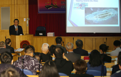 台湾东吴大学法学院今天上午在东吴城中院区大楼会议室举行“南海仲裁案暨国际化研讨会”,马英九在会中指出,海洋仲裁庭对太平岛及整体南海与南沙群岛裁判之失焦,违反国际法之基本原则。(图片来源:台湾《联合报》)