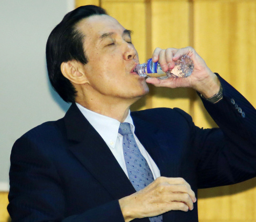 马英九在演讲的过程中,当场拿起太平岛的水告诉大家:太平岛的水没有问题,我先喝!随后一口喝下,证明太平岛的水绝对可以生饮。(图片来源:台湾《联合报》)