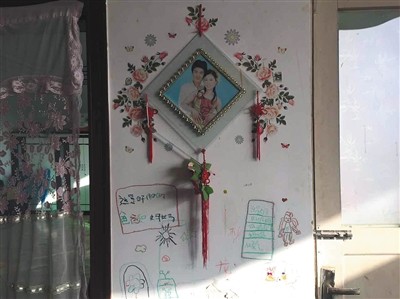 11月27日,河北白范疃村,白海朋夫妻合影下是女儿涂鸦。