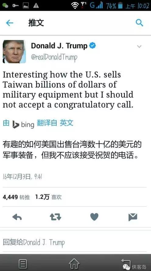 压力山大之下,特朗普2日当天就在推特上反驳:“真有意思,为什么美国卖了几十亿军事装备给台湾,我却不应该接受一个祝贺电话?”