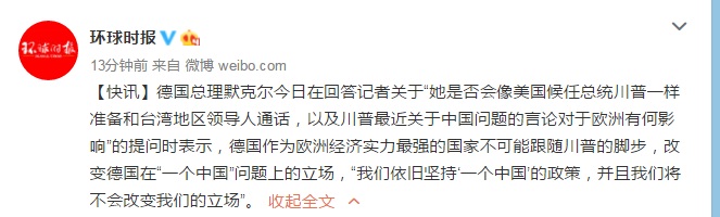 默克尔:坚持“一个中国” 不可能跟随特朗普的脚步