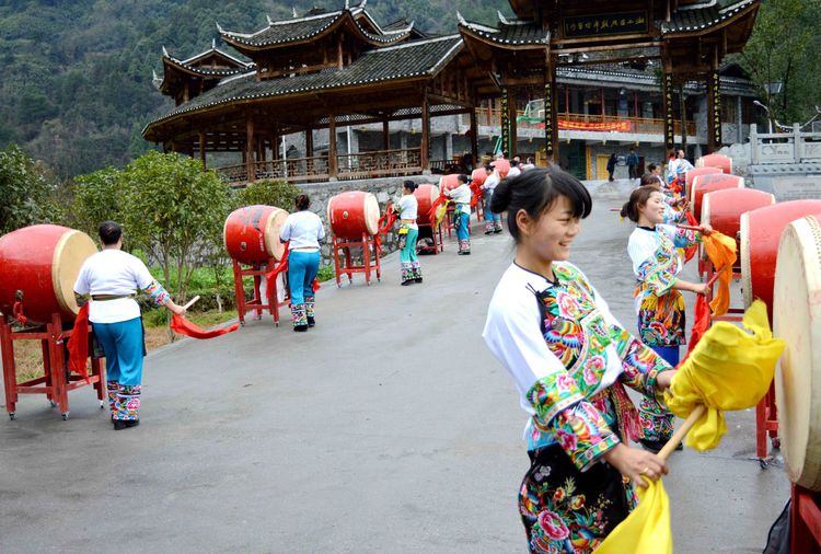 巴代雄队伍敲着大锣、吹着长号、举着苗幡、击着竹筒,驱魔祈神,保佑国泰民安;头上银光闪烁、身着节日盛装的苗族大姐们一步一摇,跳起“迁徙舞”,演绎苗族千辛万苦的迁徙史,启示人们珍惜和谐盛世,合力奔向小康;华服翩跹的姑娘们,摆动轻盈的腰肢,挥舞多彩的花伞,成群结队跳起接龙舞,接祥纳福……
