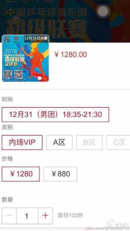 12月18日凌晨,央视乒乓球专项记者李武军透露,在12月29日-31日于鞍山举行的乒超联赛总决赛门票,最高售价已破千元,“仅以男团决赛为例,VlP价格1280元,A区票880元(B,C区未公布)。”