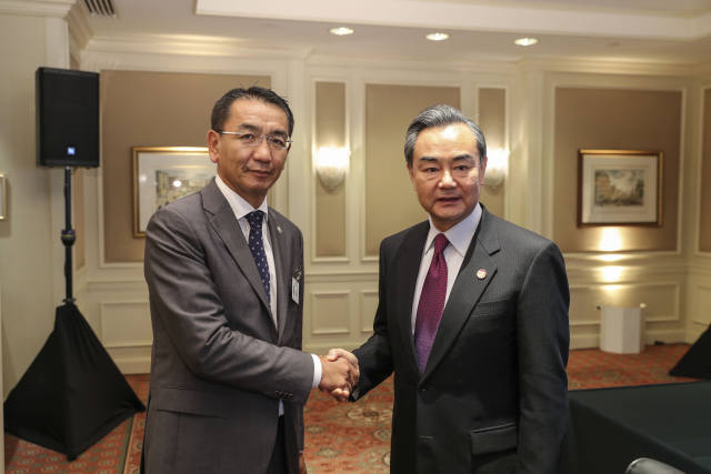 蒙古国外长蒙赫奥尔吉勒(左)与王毅资料图