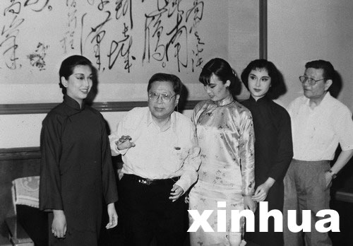 1990年,曹禺观看年轻演员重新排练演出的《北京人》后与演员、导演交谈。
